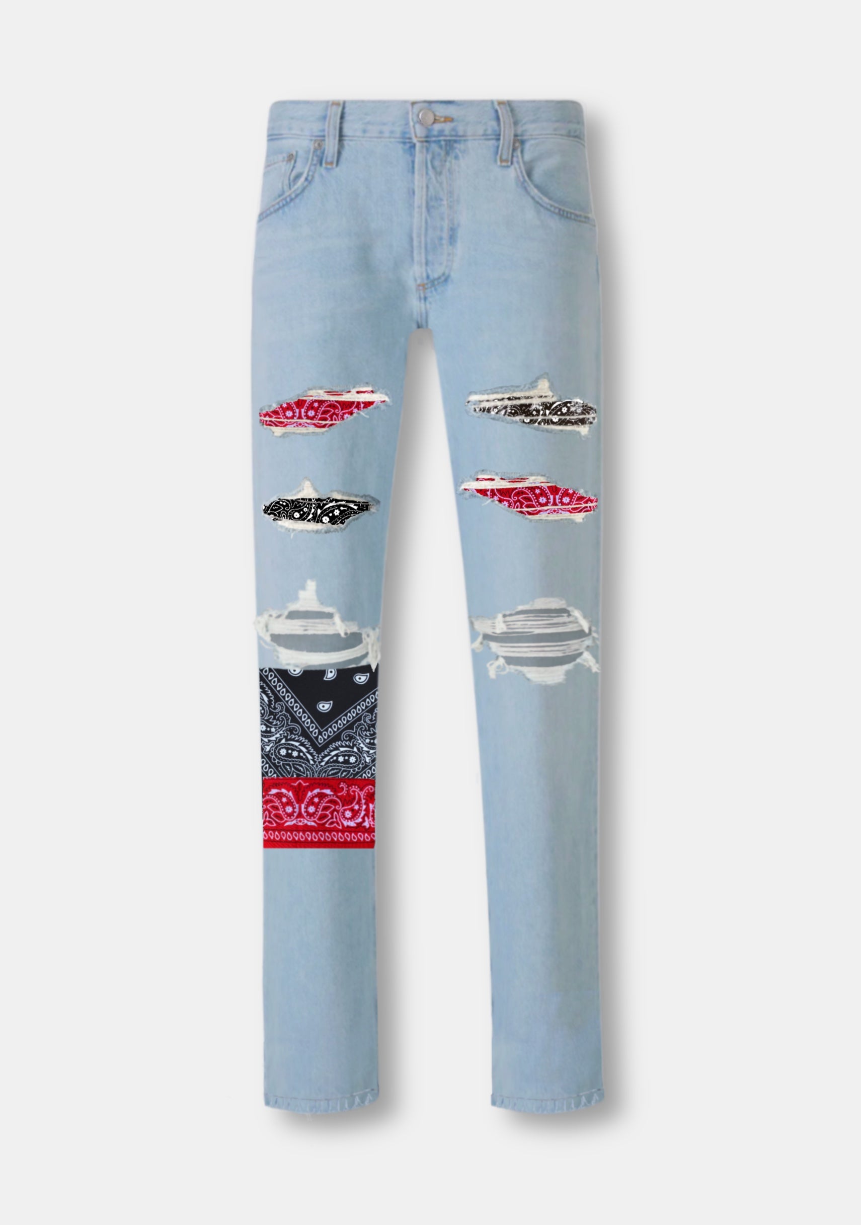 SKINNY JEAN FEATURING BANDANA PATCHES. DISTRESSED BY HAND TO ACHIEVE A COOL WORN-IN LOOK. DESIGNED TO STAND OUT.