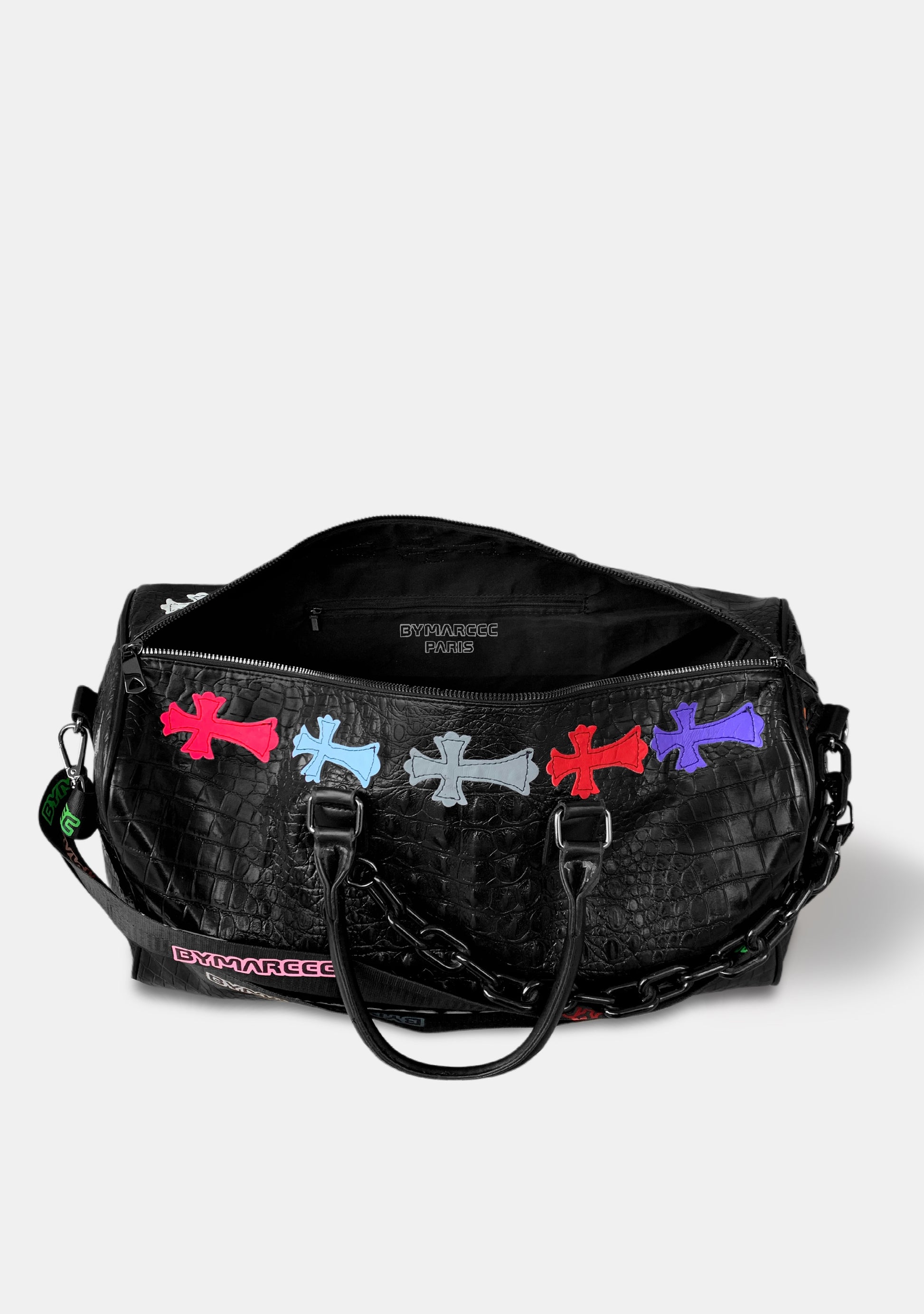 LUXURY DUFFLE BAG ADORNED WITH COLORFUL CROSSES, A SIGNATURE BYMARCCC TRAVEL TAG, AND ELEGANT BLACK CHAIN DETAILING.