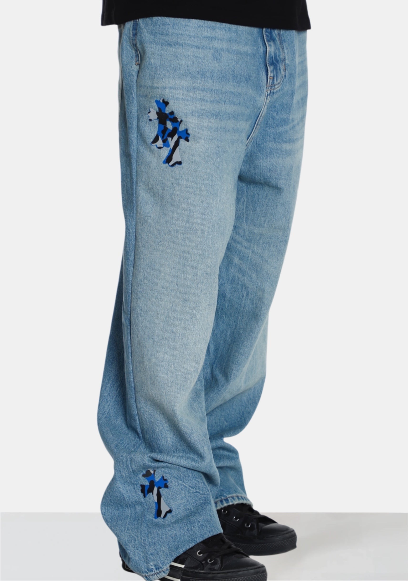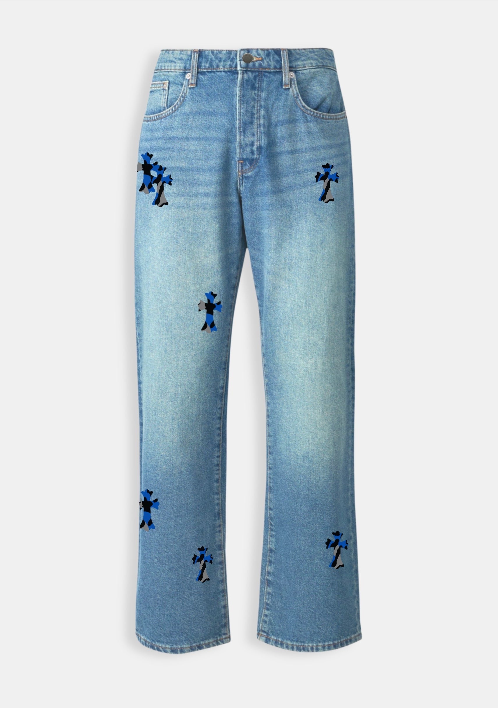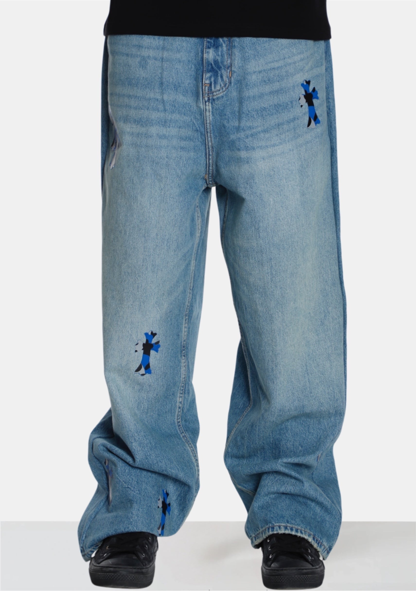 BAGGY JEANS WITH BLUE COWBOY PATCHED CROSSES. DESIGNED TO STAND OUT.