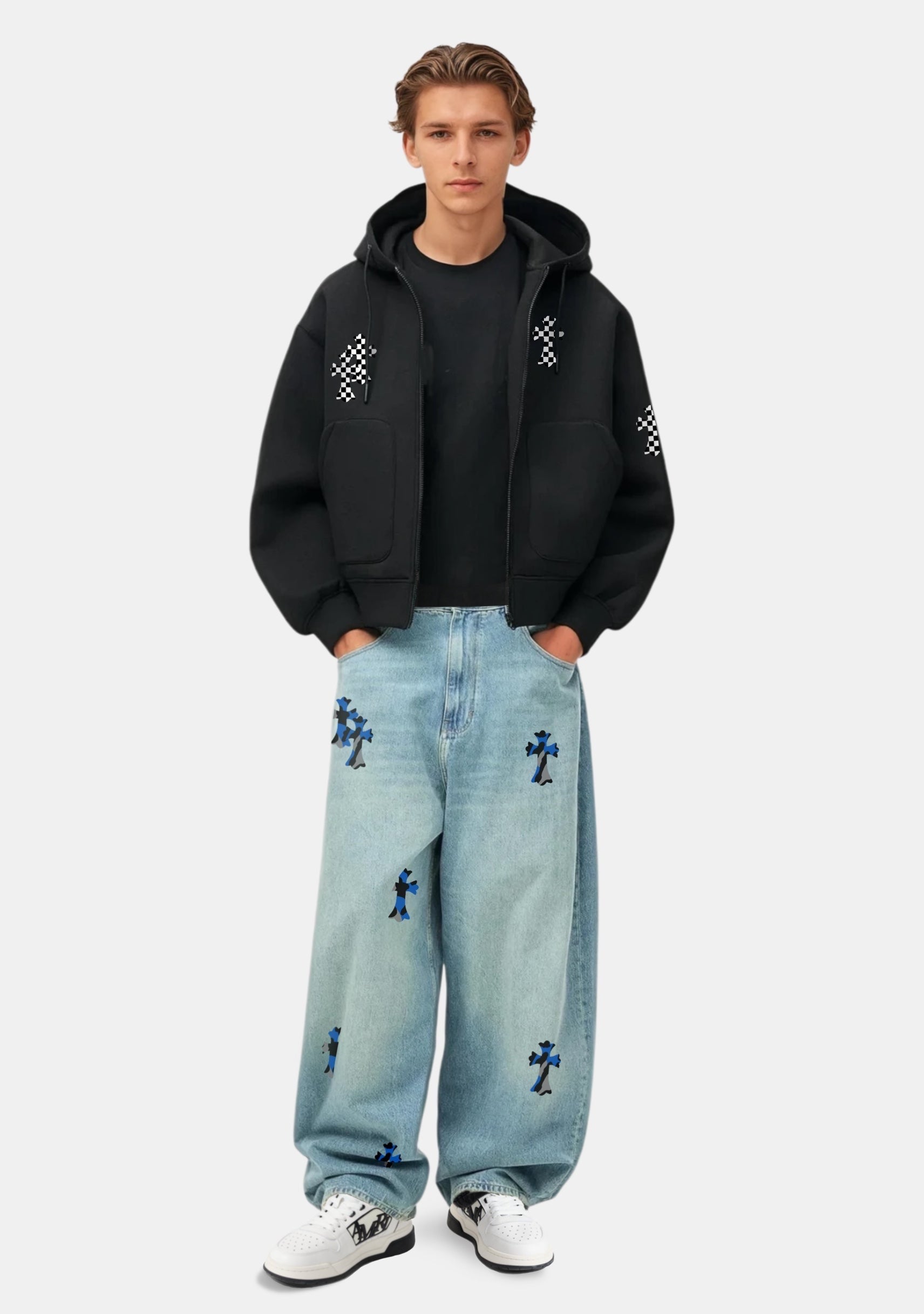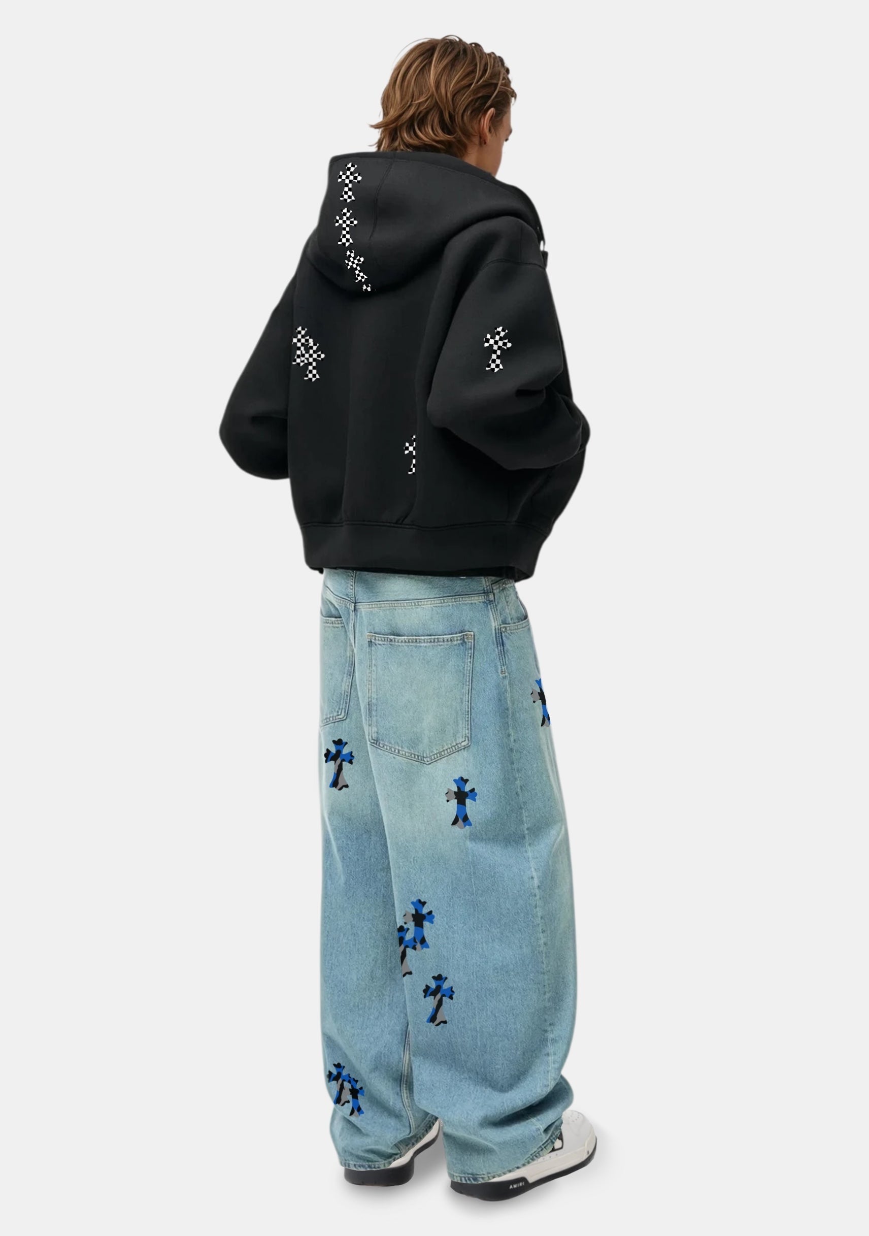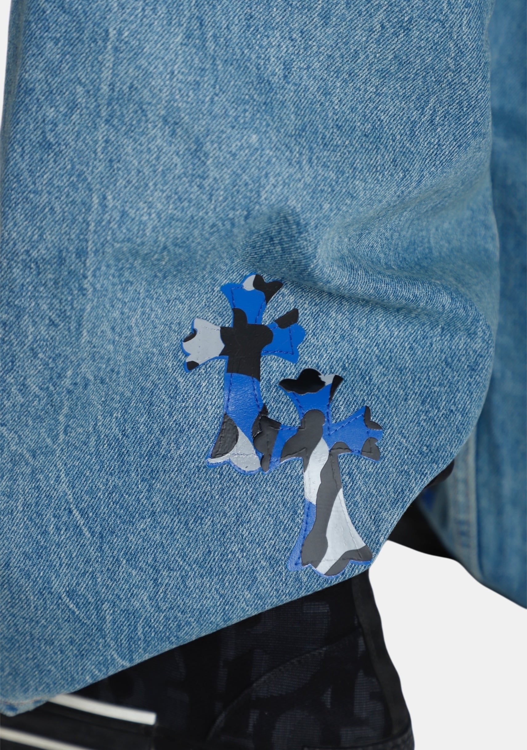 BAGGY JEANS WITH BLUE COWBOY PATCHED CROSSES. DESIGNED TO STAND OUT.