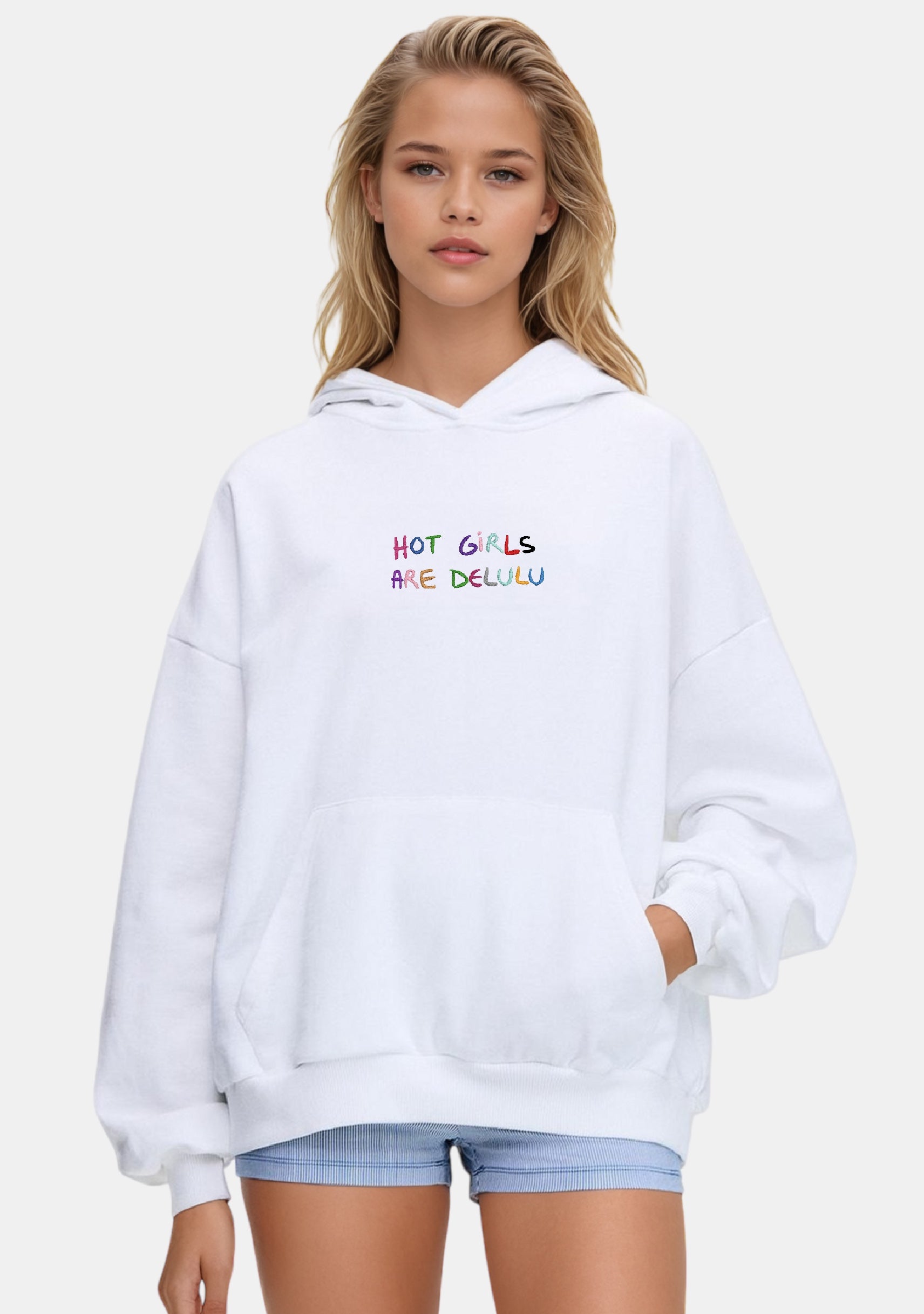 HOT GIRLS ARE DELULU EMBROIDERY ON HOODIE.