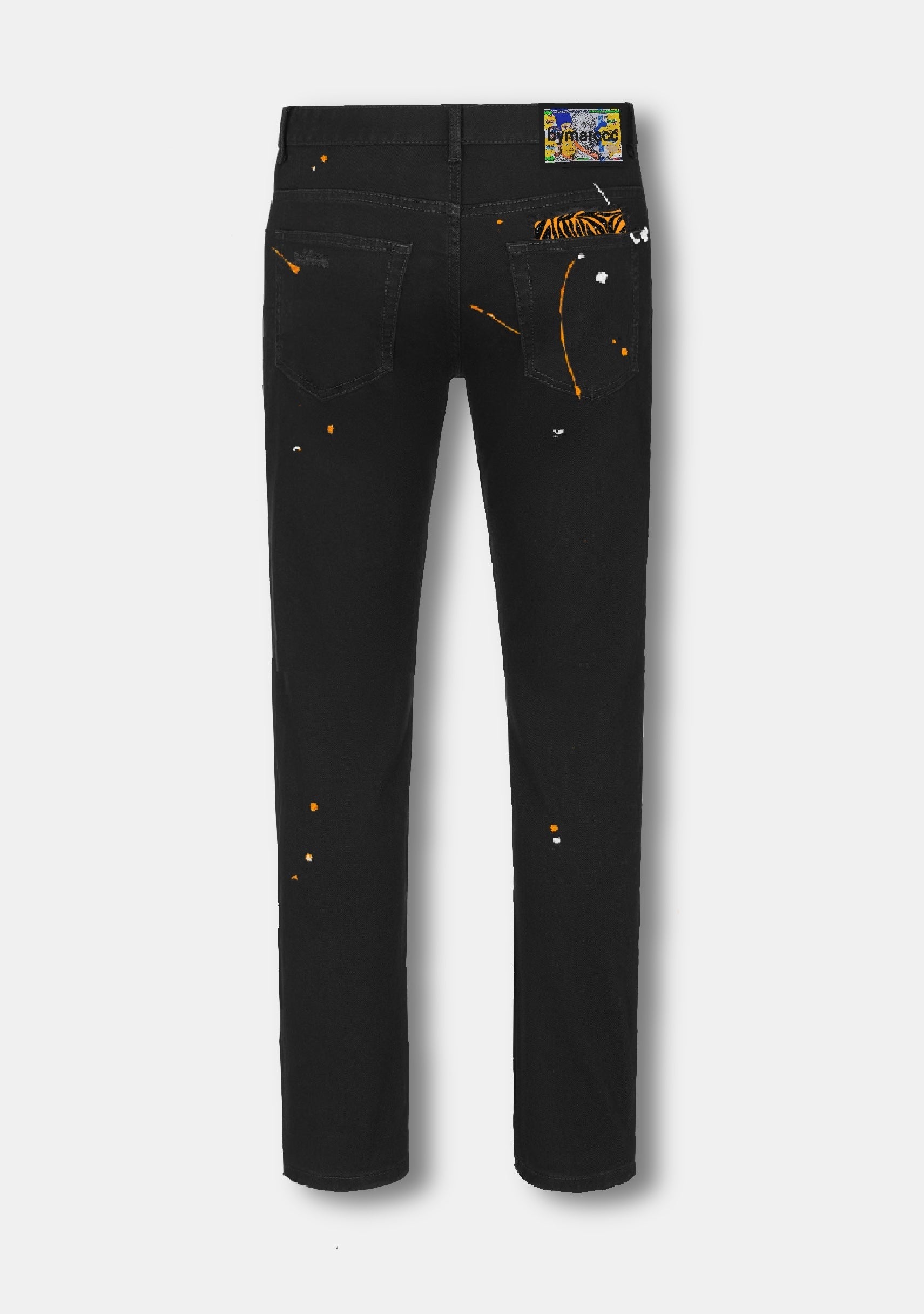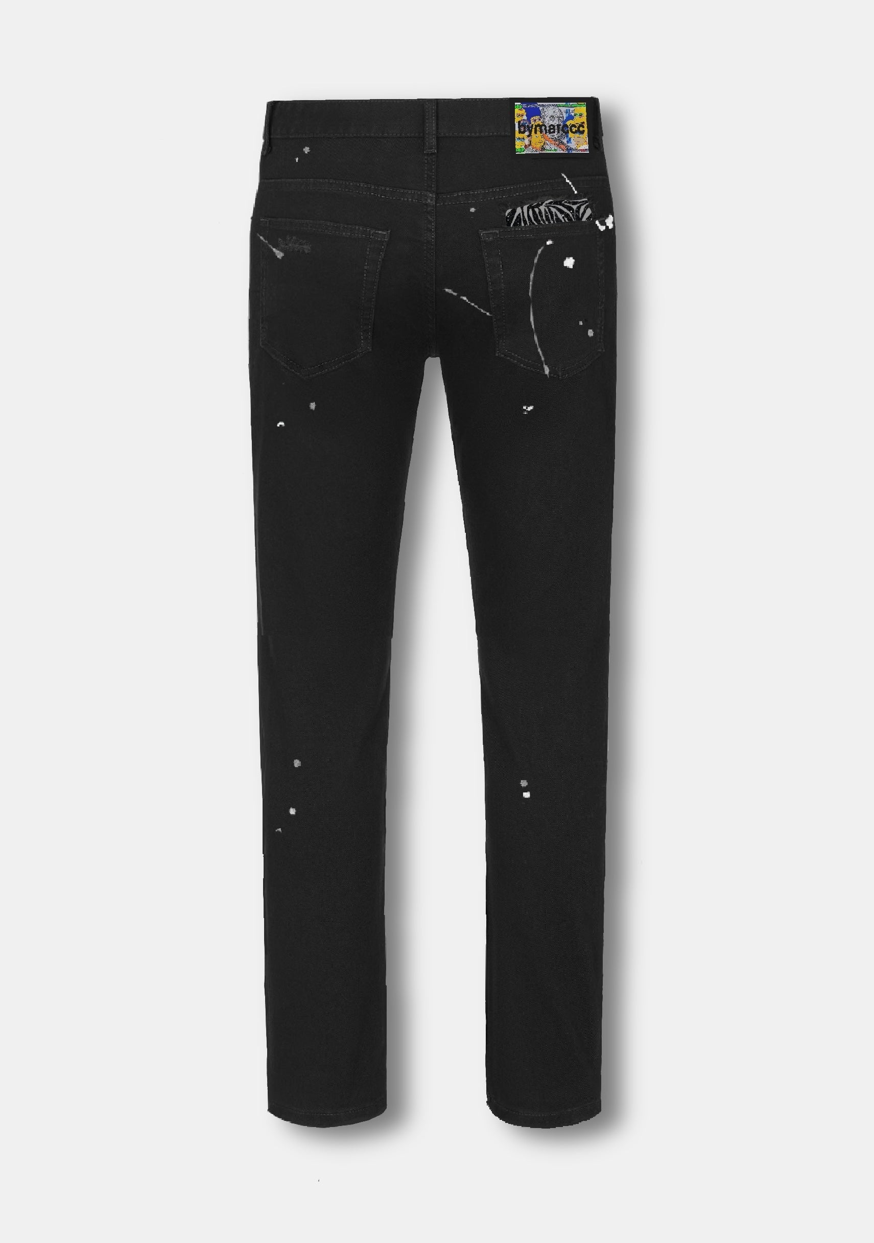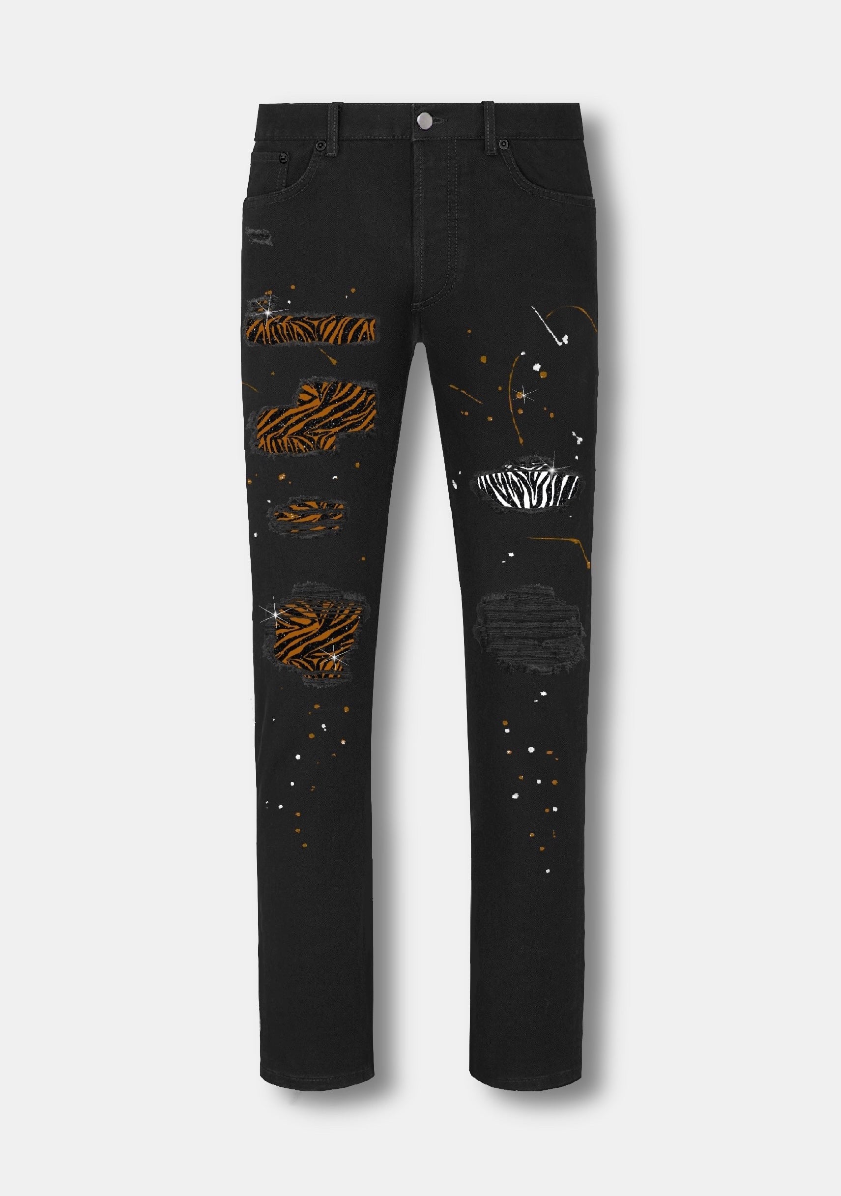 BLACK JEAN WITH ZEBRA PATCHES, DISTRESSED BY HAND TO ACHIEVE A COOL WORN-IN LOOK