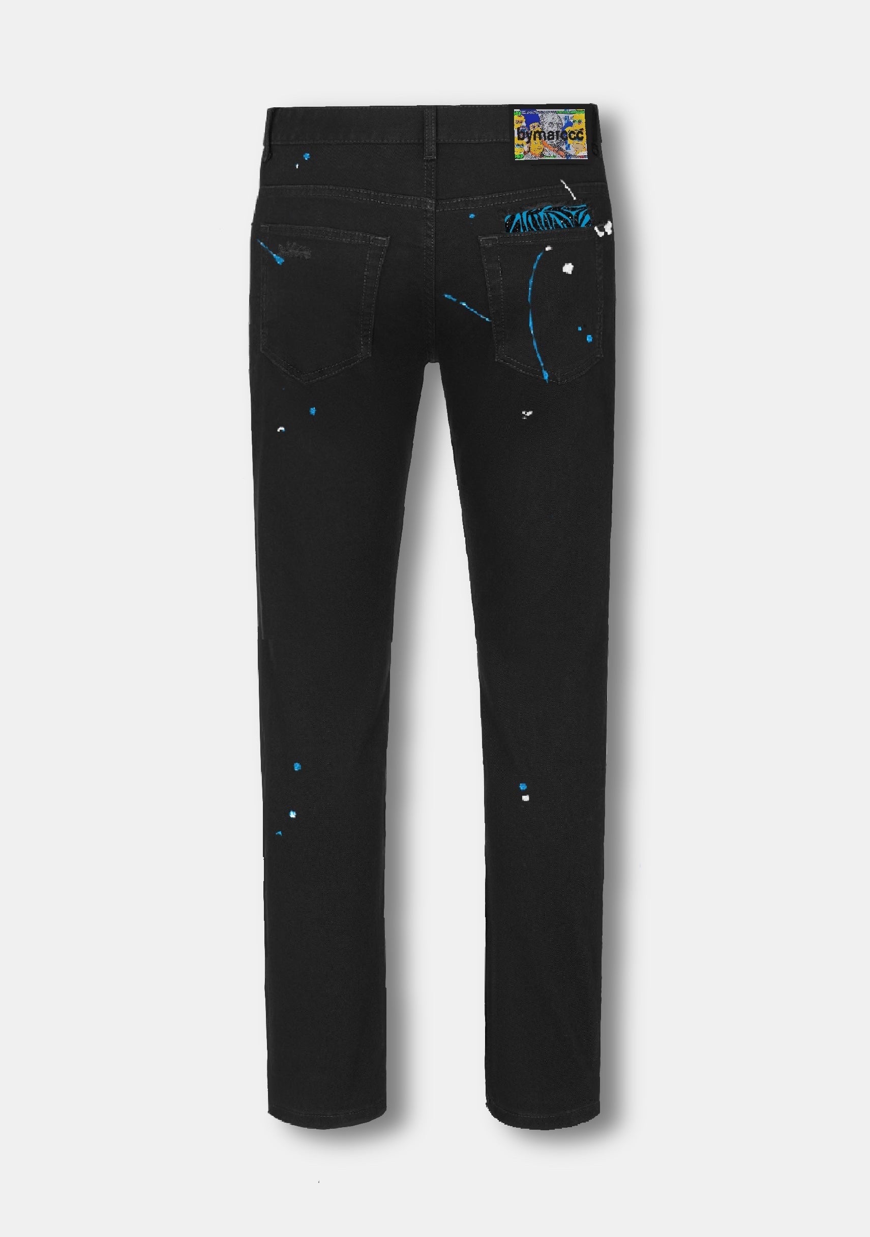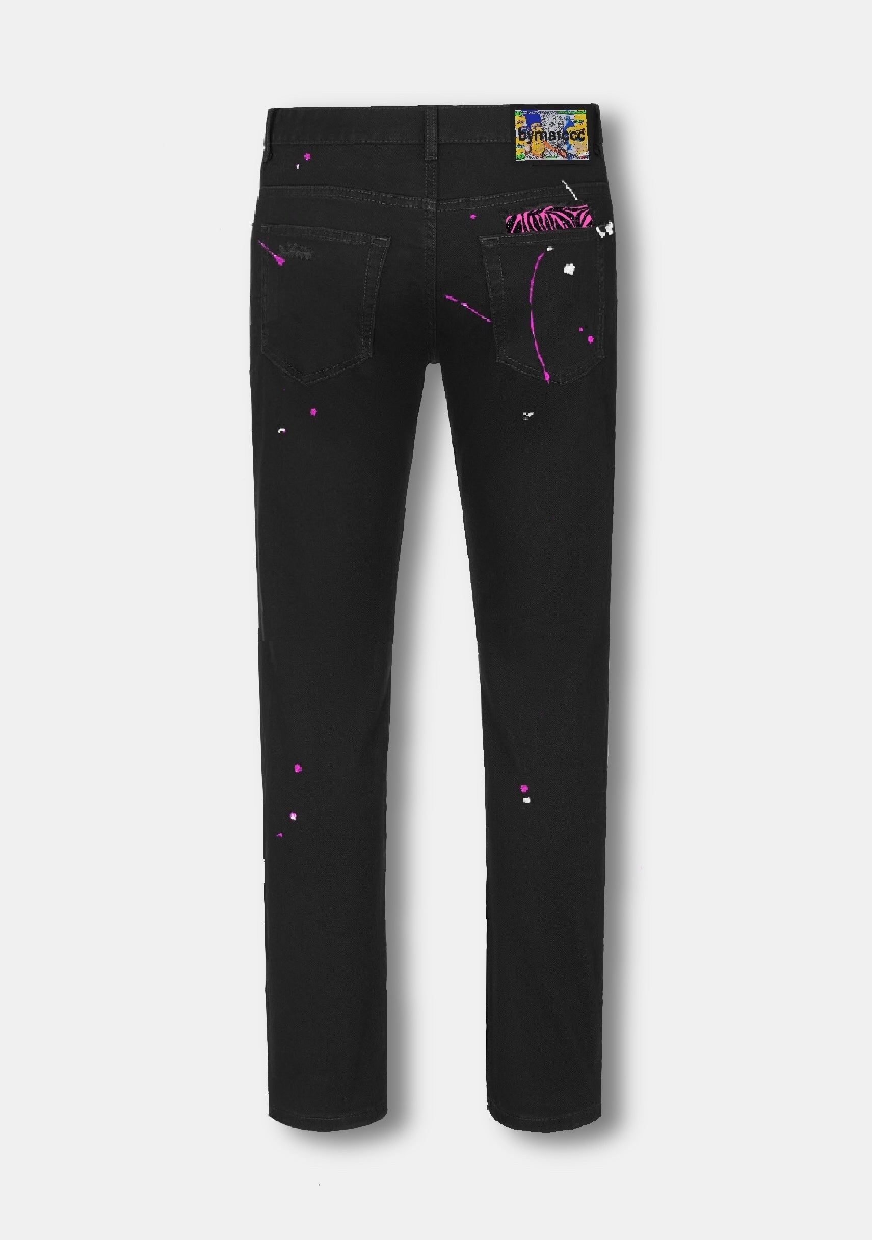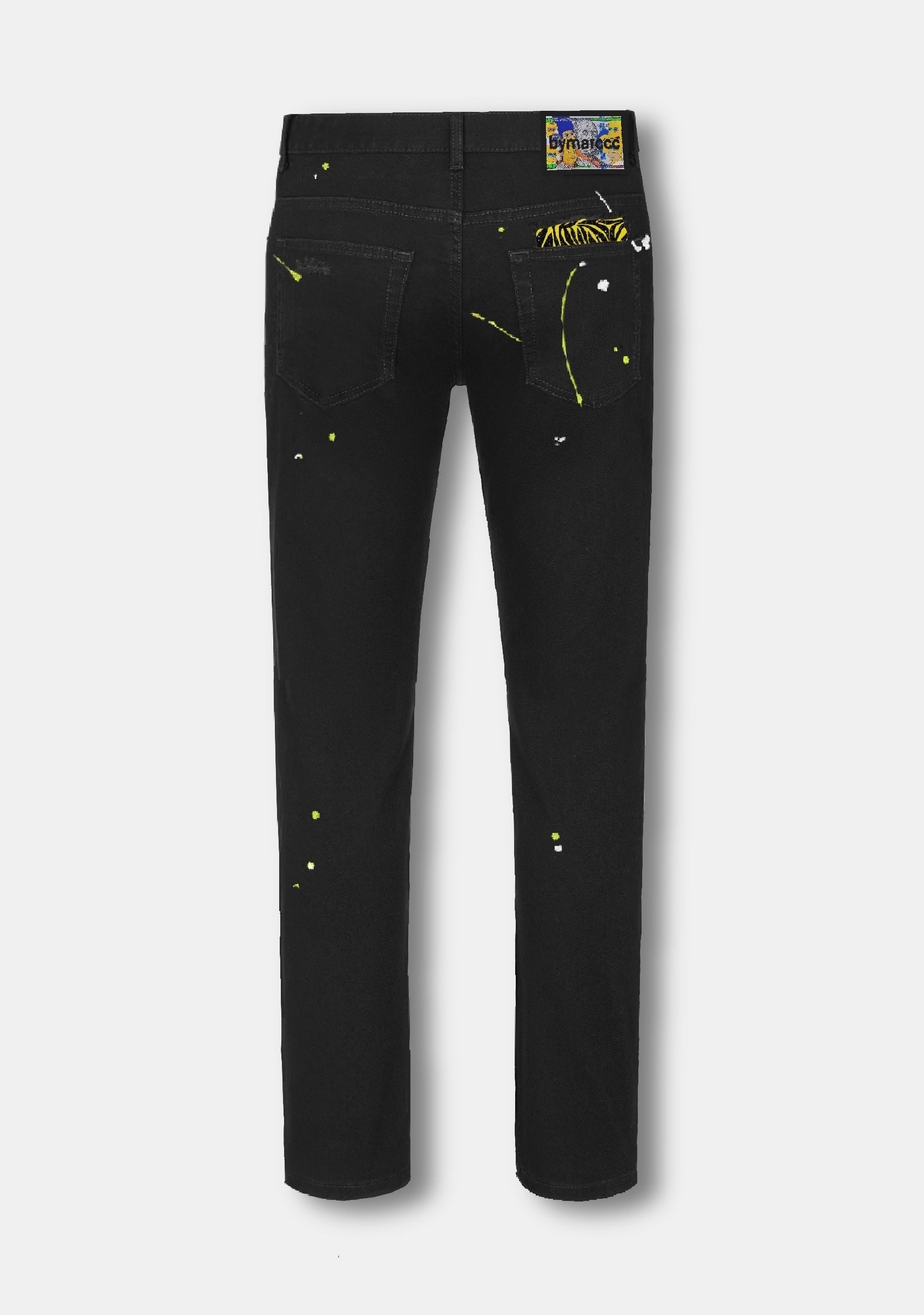 BLACK JEAN WITH ZEBRA PATCHES, DISTRESSED BY HAND TO ACHIEVE A COOL WORN-IN LOOK