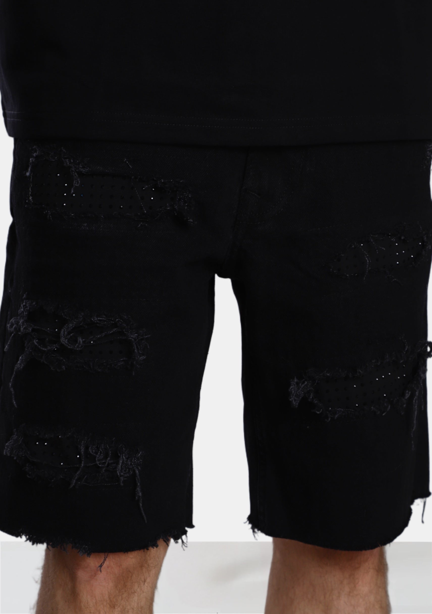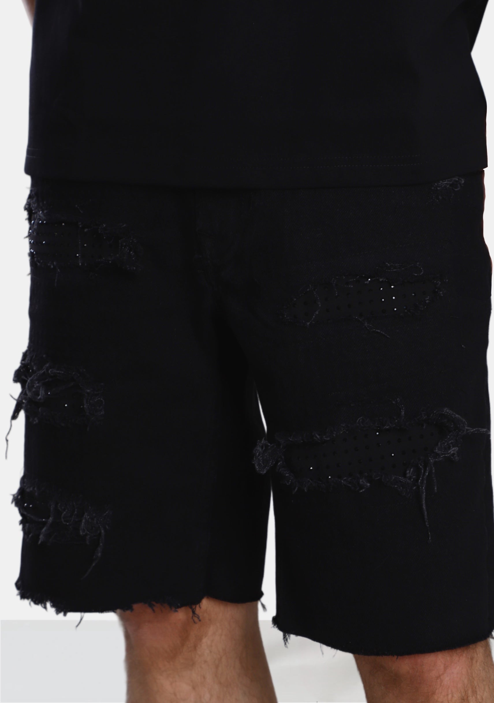 BLACK JEAN WITH BLACK SWAROVSKI PATCHES, DISTRESSED BY HAND TO ACHIEVE A COOL WORN-IN LOOK.