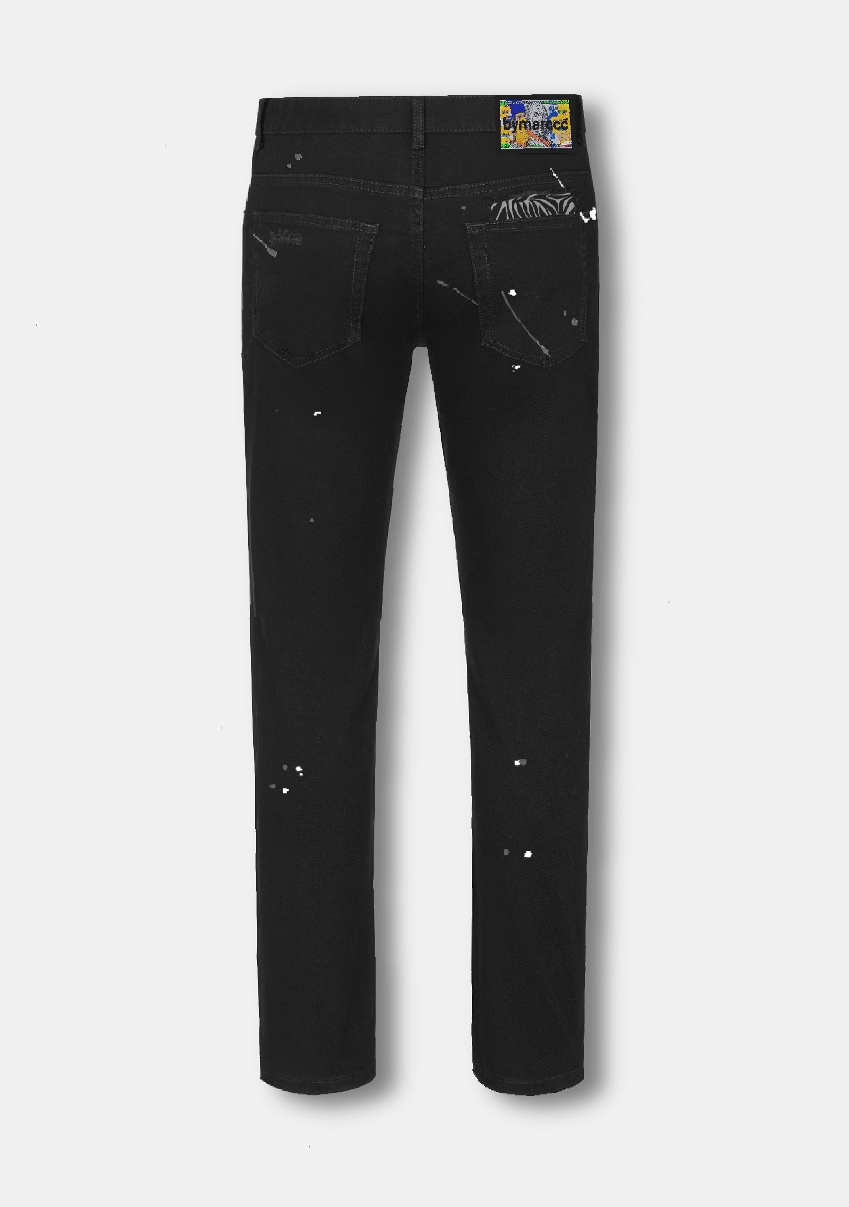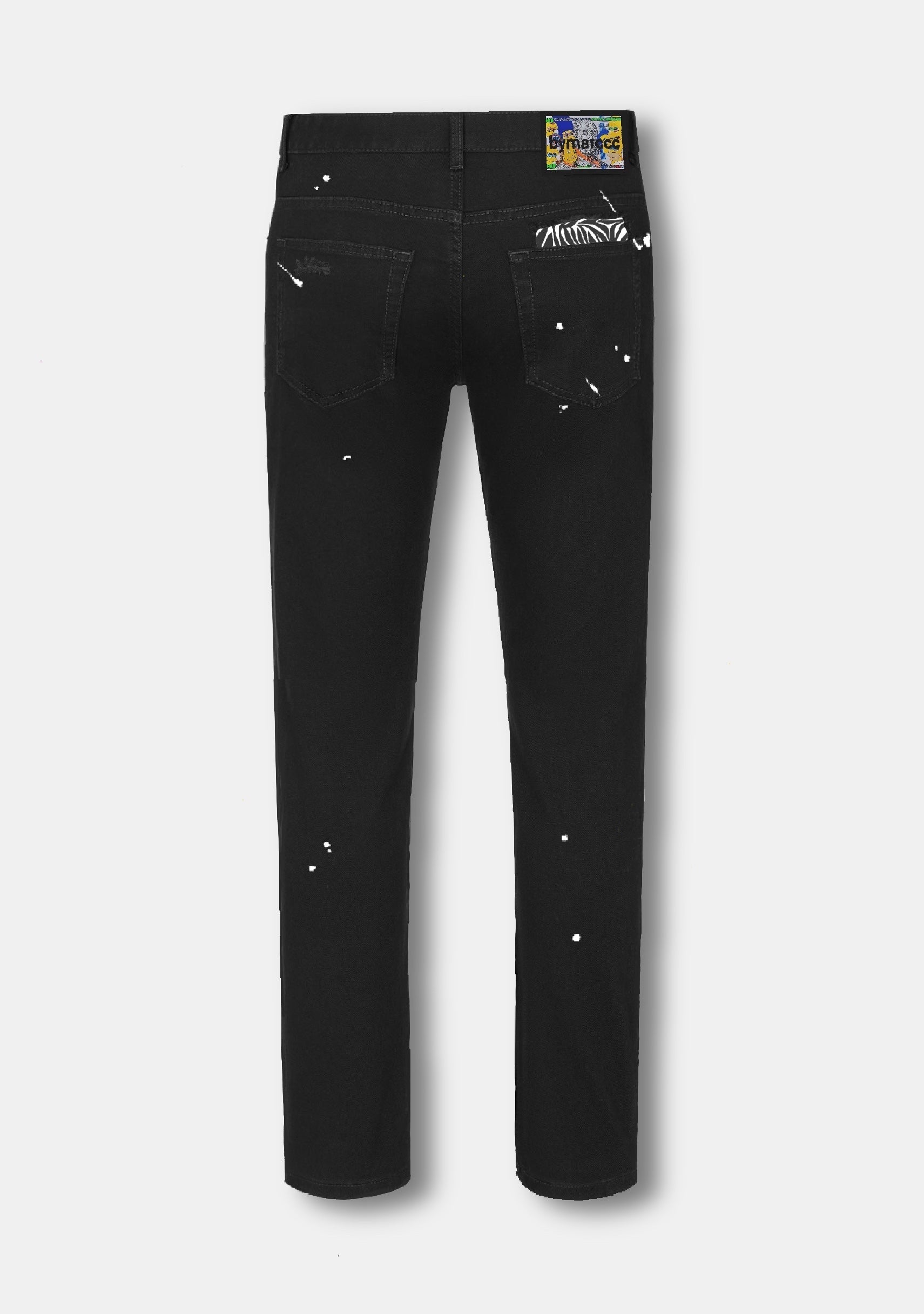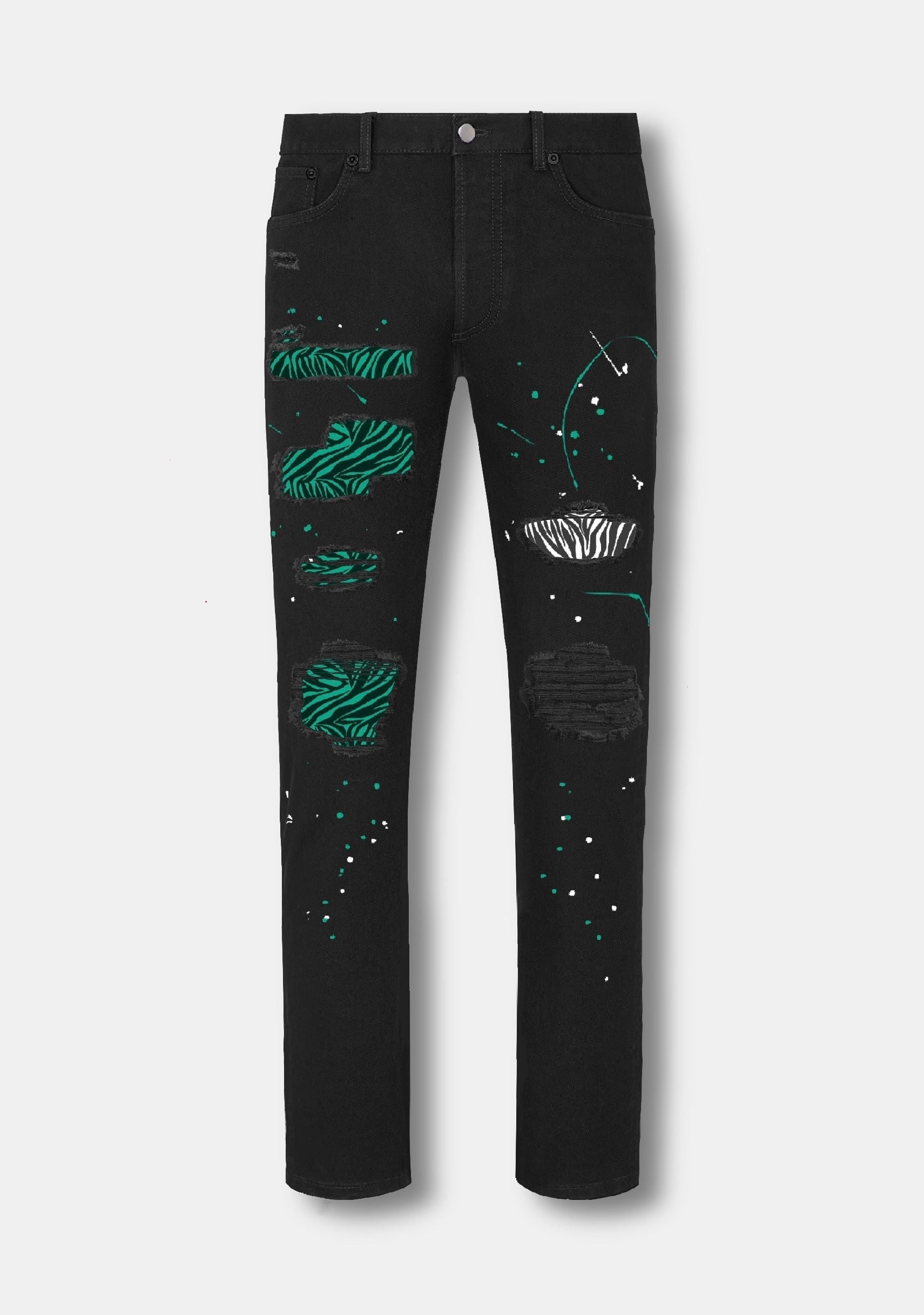 BLACK JEAN WITH ZEBRA PATCHES, DISTRESSED BY HAND TO ACHIEVE A COOL WORN-IN LOOK